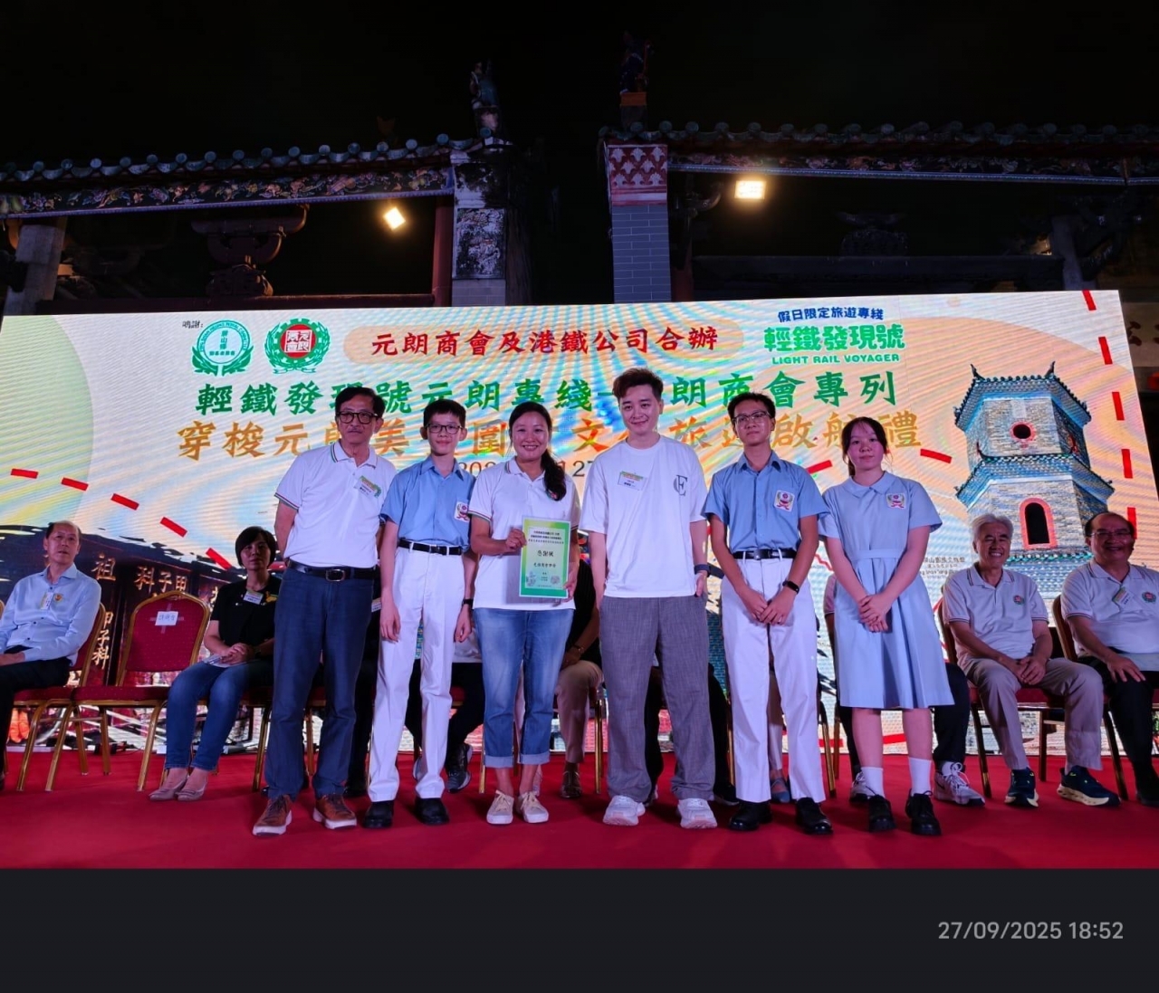 Our school participated in the launch ceremony of the “Light Rail Voyager – Yuen Long Sightseeing Route” event jointly organized by the Yuen Long Merchants Association and the MTR Corporation Limited on September 27, 2025, guiding participants to deeply experience Yuen Long's rich culinary and walled-village culture. During the event, our Secondary 3 to Secondary 5 students served as cultural tour guides in Ping Shan, providing an in-depth historical and traditional tour for over 200 participants, including teachers and students from local primary schools and kindergartens, as well as other guests. The tour route included the following four stops:
