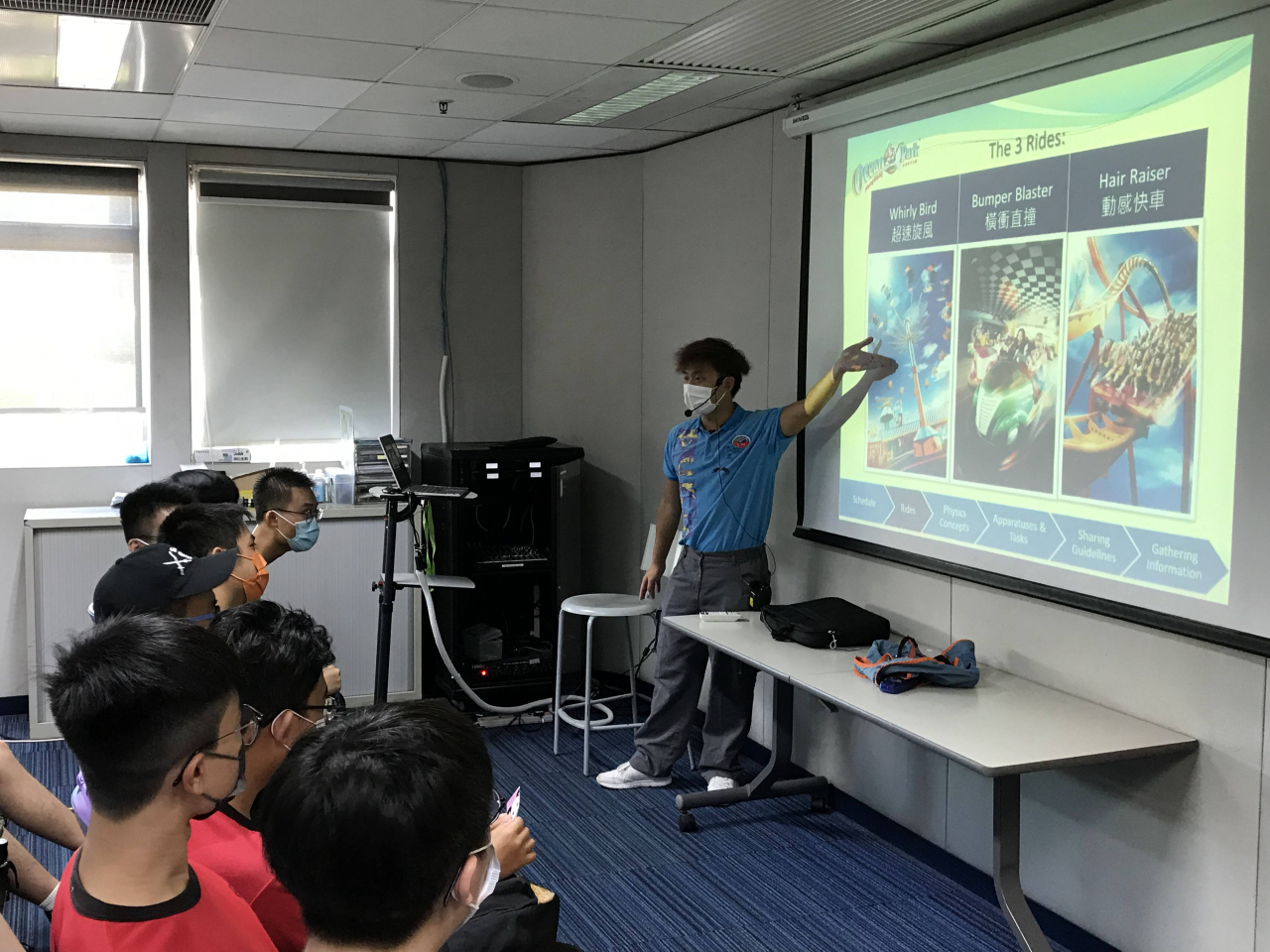 On 14th July 2021, S.5 physics students took a physics learning journey in the Ocean Park. Students were divided into groups to take different courses organized by the Ocean Park. Students enjoyed the journey since they had the opportunity to hop on one of Ocean Park's mechanical rides in Thrill Mountain. The rides include: